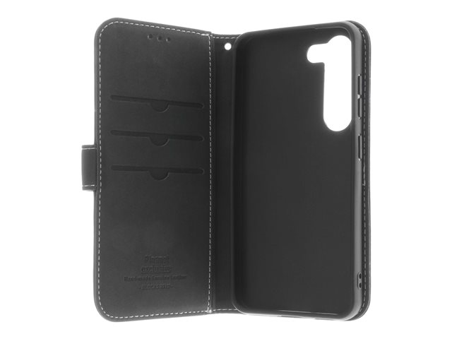 Insmat Exclusive - Läppäkansi matkapuhelimelle - aito nahka, paperi, polyuretaani, pahvi, puuvilla, alumiinifolio, pronssi, termoplastinen polyuretaani (TPU) - musta malleihin Samsung Galaxy S23+