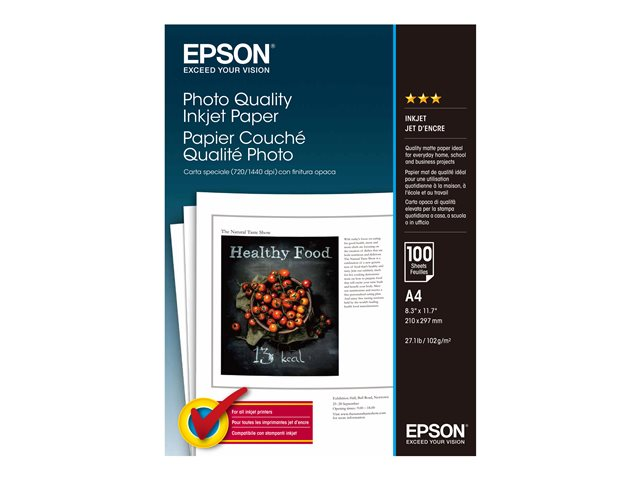 Epson Photo Quality Ink Jet Paper - Matta - päällystetty - puhdas valkoinen - A4 (210 x 297 mm) - 102 g/m² - 100 arkki (arkit) paperi malleihin EcoTank ET-2810, 2815, 2825, 2826, 2850, 2851, 2856, 4800, 4850; SureColor SC-P700, P900