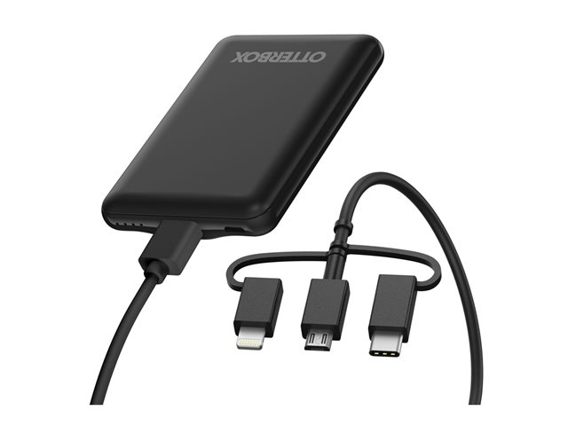 OtterBox Standard Mobile Charging Kit - Virtapankki - 5000 mAh - 10.5 watti(a) - 2.1 A - Apple Fast Charge, FC (USB) - johdossa: Lightning/Micro-USB/USB-C - musta